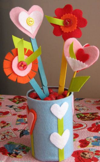 Outra opção é fazer flores e corações de feltro e posicioná-las em uma lata também revestida com feltro.