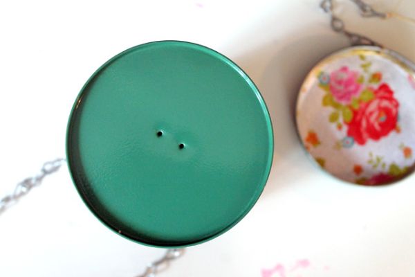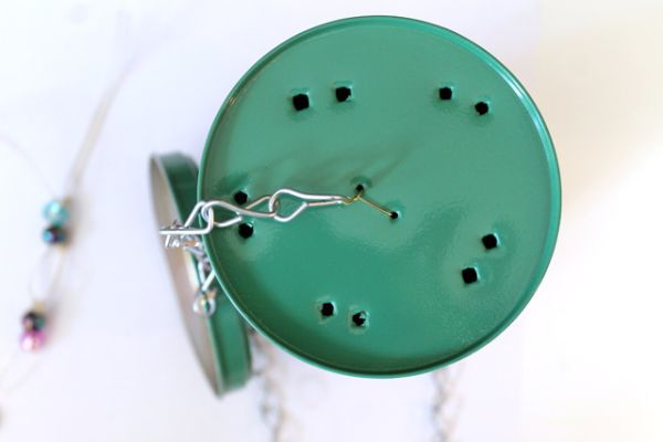 Em seguida, faça um furo na borda da tampa, fixe um pedaço de corrente e amarre um pedaço de arame na ponta da corrente.