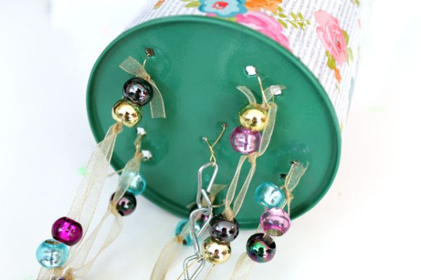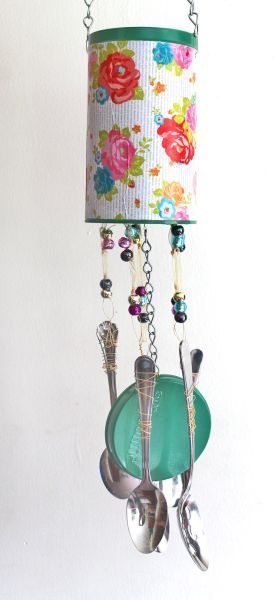 Agora, para finalizar a sua peça, amarre os talheres com pedrarias no fundo de sua lata. E está pronto!