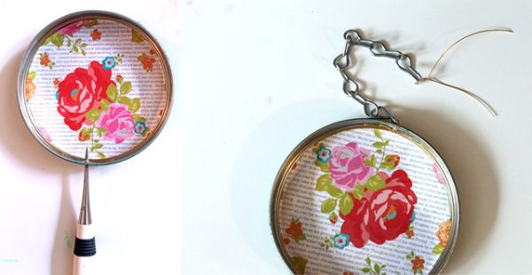 Logo após, fixe um pedaço de corrente, para pendurar o seu enfeite. Utilize pedaços de arame para fixar a corrente nos furos.