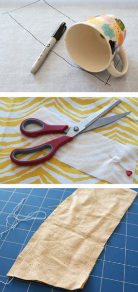 Comece fazendo um molde com a xícara escolhida, papel e caneta. Deslize a peça fazendo um molde de acordo com a estrutura da peça. Depois transfira este molde de papel para os tecidos escolhidos, cortando duas partes e deixando margem de costura. Costure três partes, deixando uma das pontas abertas.