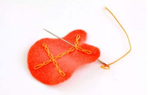 Em seguida, com o auxílio da linha laranja e da agulha de bordar, borde o feltro salmão com ponto correntinha, garantindo o formato de peixinho para a pecinha de feltro.