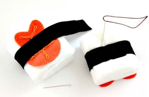 Se você gosta de trabalhar com feltro, porém já esgotou todas as suas ideias sobre artesanatos com este material, pode recorrer a um enfeite que imita comida japonesa e que deixa sua mesa muito bem decorada e faz seus convidados pensarem que o sashimi de feltro é de verdade. E outra grande vantagem em desenvolver esta peça, é que você poderá aproveitar os retalhos de feltro que você já tenha em casa, fazendo assim, também uma bela reciclagem de materiais.