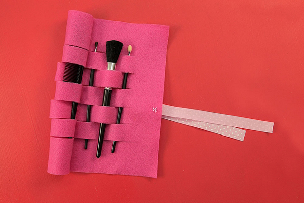Comece separando todos os materiais que você vai utilizar em seu artesanato. Corte um retângulo no feltro com tamanho que consiga acomodar todos os seus pincéis, mas deixando sobras em todos os lados. Na parte interna, risque muitas tiras no feltro, porém sem chegar à borda. Corte as tiras. Costure um pedaço de fita dobrado ao meio em uma das pontas do seu estojo. Agora basta posicionar os pincéis nas tiras, “trançando” os pincéis pelas tiras.