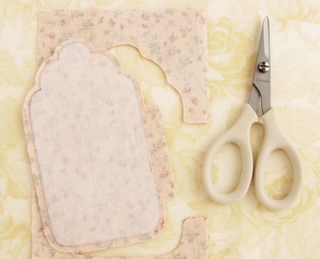 Comece escolhendo um modelo de etiqueta e transferindo este modelo para entretela. Depois fixe a entretela, com o auxílio do ferro para passar roupas, em um pedaço do tecido escolhido. Então recorte ao redor, seguindo contorno da etiqueta, porém deixando uma sobra de tecido, principalmente uma sobra maior em uma das laterais. E corte uma segunda peça seguindo a primeira.