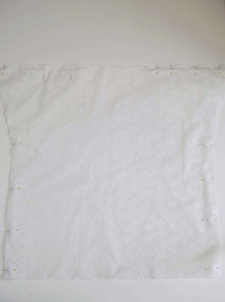 Em seguida, posicione e prenda com os alfinetes para costura as duas partes da blusa, com os lados direitos dos tecidos juntos.