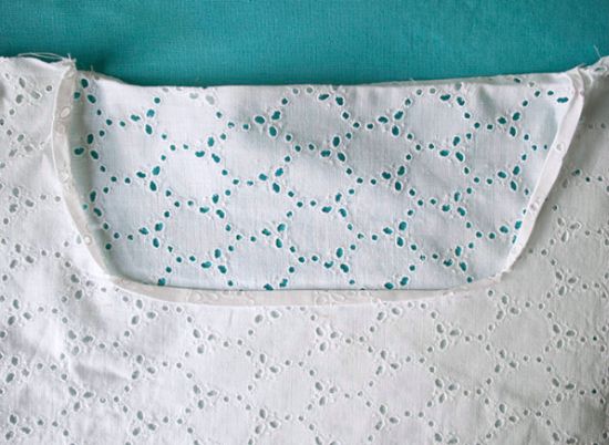 Agora, para fazer o acabamento do decote, dobre uma margem de tecido para o lado do avesso e passe uma costura reta.