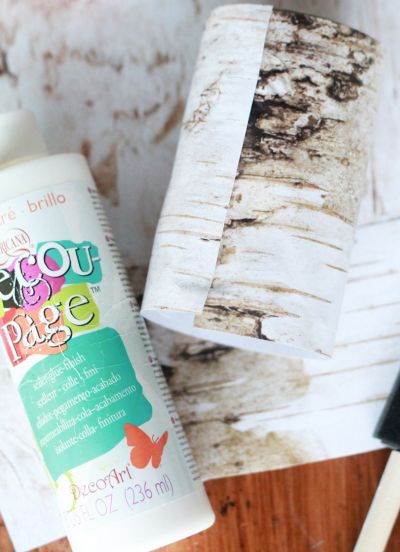 Comece medindo o tamanho da lata escolhida. Depois corte um pedaço de papel para scrapbook com estampa de madeira com o tamanho da lata, e sobrando um pouco no comprimento, para poder sobrepor uma extremidade sobre a outra ao envolver a circunferência da lata.