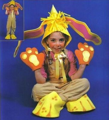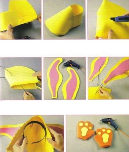 Na parte que irá na cabeça (em formato de capuz), cole as duas partes e faça uma abertura para colocar as orelhas, que devem ser duplas e ter um arame dentro para dar firmeza e mantê-las dobradas e na posição que você quiser. Passe primeiramente o arame pela abertura do capuz, arremate para não machucar a cabeça e não soltar e então coloque as orelhas sobre este arame. Posicione o arquinho de cabelo nos arames já fixados dentro do capuz, para não cair da cabeça, e cole a fita de cetim nas extremidades para amarrar no queixo. E finalize a fantasia montando as patinhas e pintando o sapatinho como se fosse a patinha do coelho. Se quiser coloque “cabelinhos” na parte da frente da cabeça, cortando fitas finas de EVA amarelo. E está pronto!