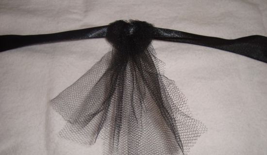 Comece cortando três pedaços de tule preto com tamanho de 15 x 30 cm. Dobre os pedaços de tule juntos e ao meio e passe pela fita de cetim e dê um nó. E faça o mesmo com o tule roxo. E vá fazendo isso até formar a sainha. Vá medindo na cintura de sua menina até chegar ao tamanho exato de saia.