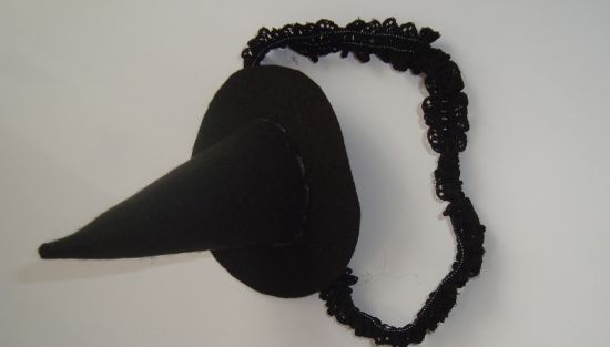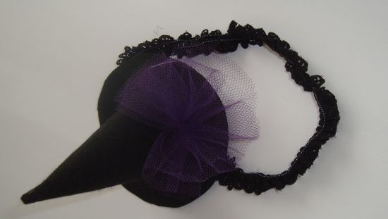 Agora transfira o molde do chapéu para o feltro preto. Recorte e cole todo o chapéu com cola quente. Meça o passa fita elástico na cabeça de sua filha, recorte e costure as pontas formando um círculo. E prenda no chapéu com cola quente. Para deixar o chapéu mais charmoso utilize o tule roxo e faça uma espécie de babado e cole com cola quente na aba do chapéu. E está pronta sua fantasia! Para que a fantasia fique completa, vista em sua menina um body com cor escura combinando com o restante das peças.