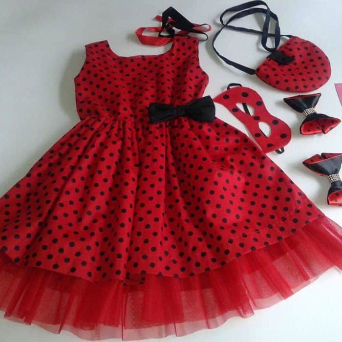A fantasia da sua menina pode ser improvisada com uma saia e blusa, com um vestido, um macacão ou um conjunto de short e blusa, com cor vermelha e estampa de bolinhas pretas. Não se esqueça da máscara. E vale também fazer em sua casa bolsa e outros acessórios fofos que você desejar.