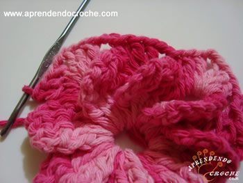 Realize 03 corr. e mais 02 p.a. nas corr. de base seguintes, *02 corr. de espaço, 03 p.a., 02 corr., 03 p.a. faça todos no mesmo espaço para formar o leque. Depois 03 p.a. nas