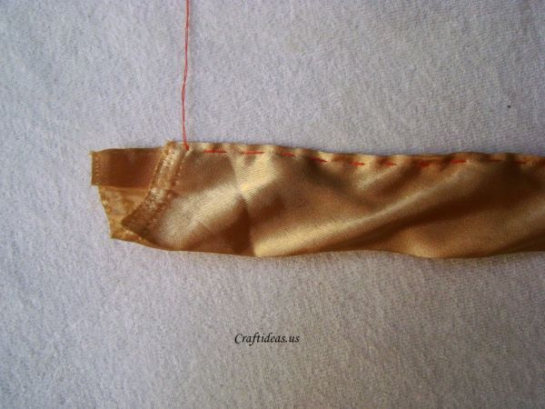 Comece separando todos os materiais que você vai utilizar em seu artesanato. Depois corte uma tira no cetim, passe as extremidades a ferro e passe uma costura reta nas dobras laterais. Dobre a tira ao meio, com o lado do direto do tecido para fora, e passe a ferro. Passe a ferro também as pontas da tira para dentro. Ao final, abra a fita e dobre a ponta da fita para o lado do avesso do tecido.