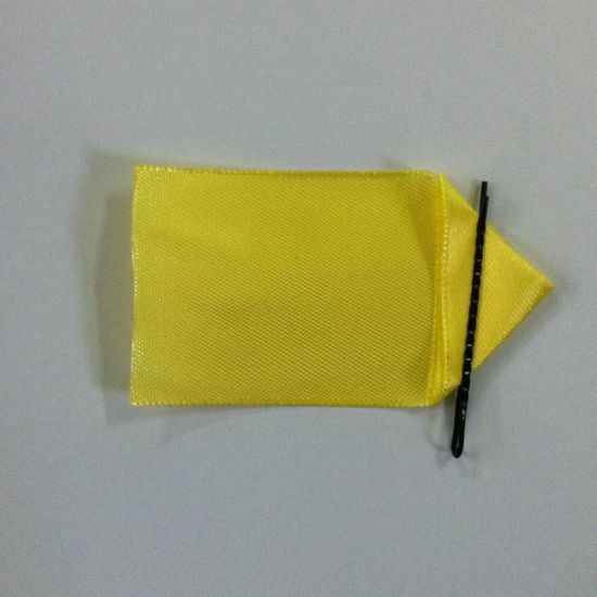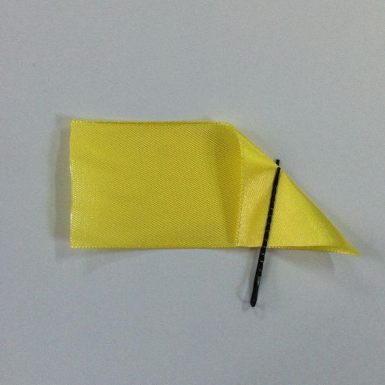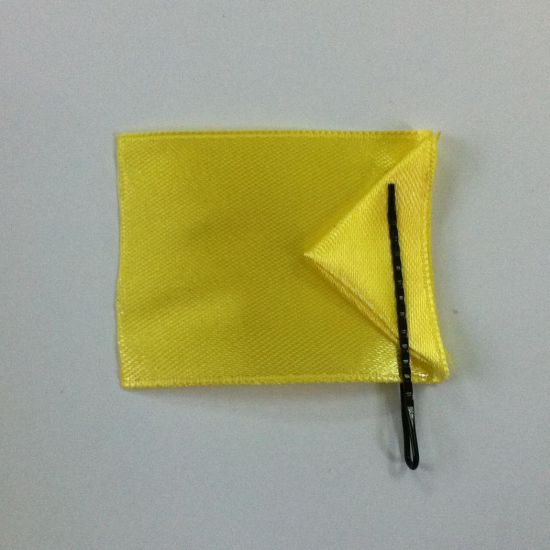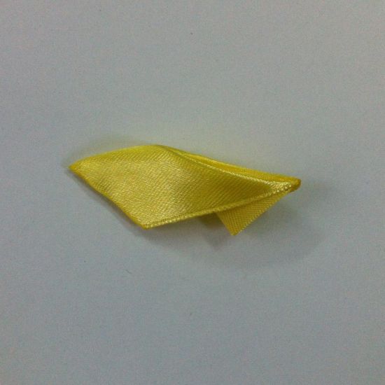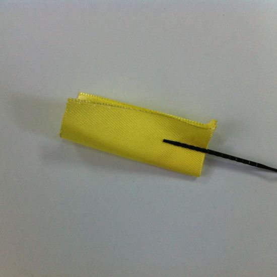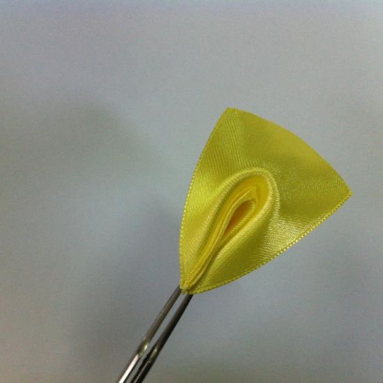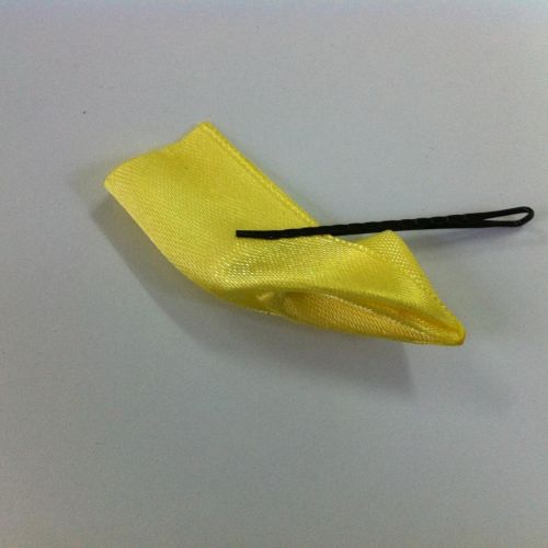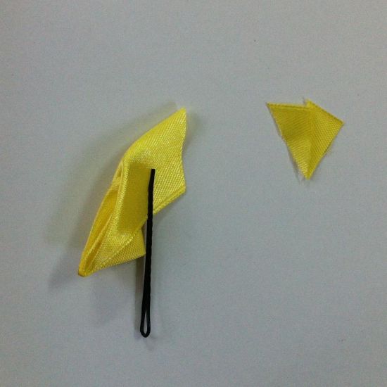 Comece cortando uma tirinha da fita de cetim. Depois posicione a fita com o lado do avesso para cima e dobre a ponta direita para baixo, prendendo com o auxílio de um grampo para cabelo.
