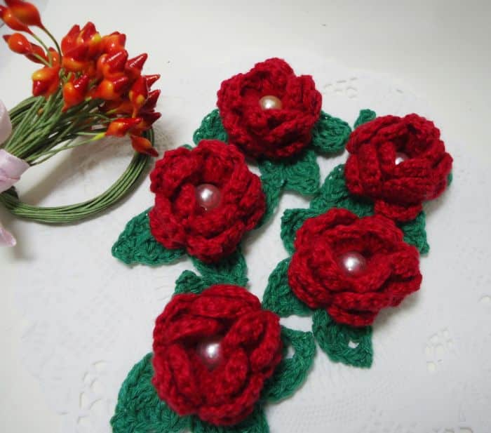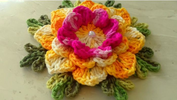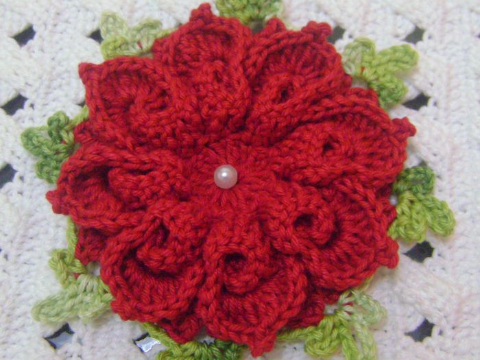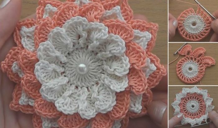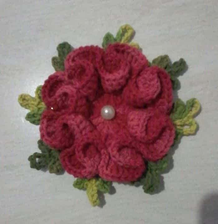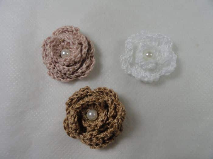 Faça 6 correntinhas, forme um círculo com elas, suba 3 correntinhas e faça mais 23 pontos altos dentro do círculo. Suba 3 correntinhas e faça outros 23 pontos altos, mas agora com 1 correntinha entre cada ponto. Para fazer as pétalas você deve fazer 3 correntinhas, 1 ponto alto triplo (pegando no espaço seguinte), 3 correntinhas, 10 pontos altos dentro do ponto alto triplo e 1 ponto baixo no espaço seguinte. Faça isso até terminar a carreira. Na parte detrás faça cinco correntinhas e 1 ponto baixo até completar a carreira, mas intercalando com as pétalas já existentes. Venha com outra carreira fazendo 5 pontos altos, 3 correntinhas e 5 pontos altos dentro de cada argola formada. Faça estas camadas até chegar ao tamanho desejado para a sua flor. Costure uma pérola no meio.