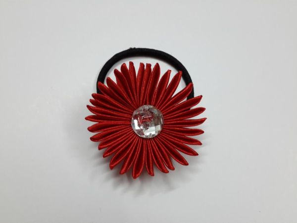 Logo após, para finalizar a sua peça, costure a sua flor de fita de cetim no elástico para cabelo. E está pronto!