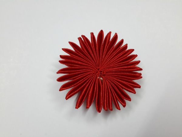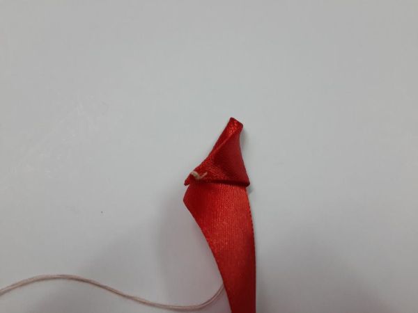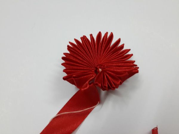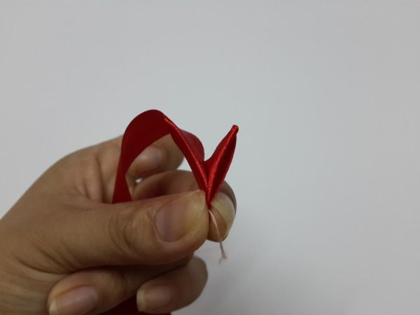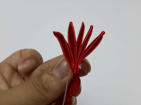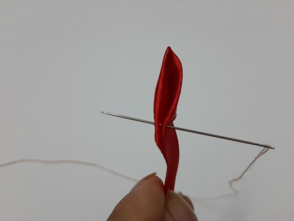 Logo após, siga fazendo dobras na fita até formar a sua flor. E ao final, prepare a dobra para arrematar a linha.