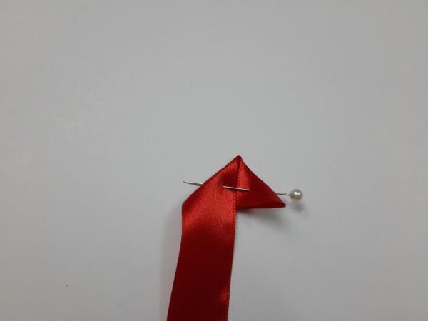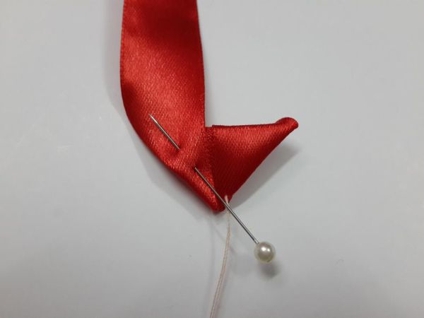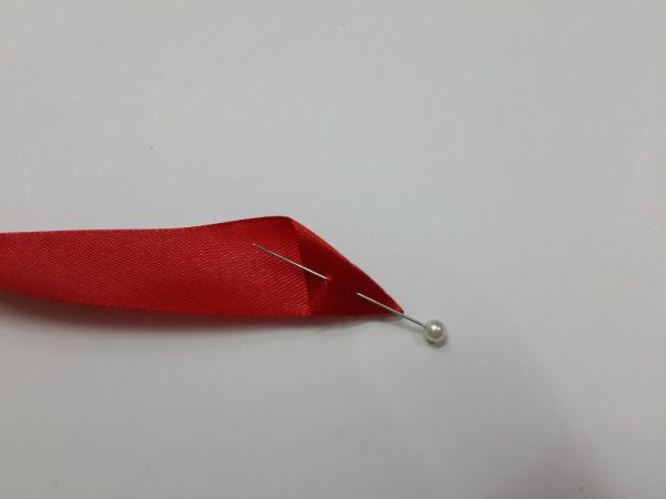 Comece dobrando a ponta da fita de cetim escolhida e prenda com um alfinete para costura.