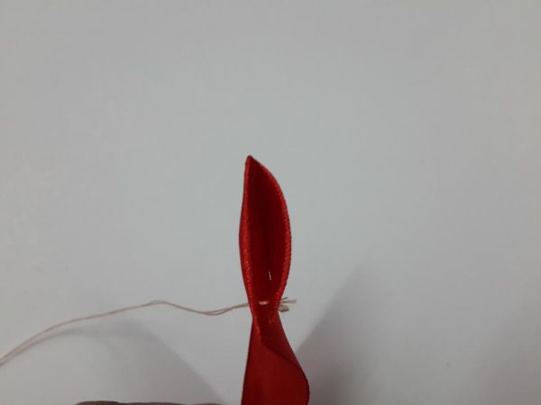 Logo após, dobre a fita de cetim como fez a primeira dobra. E prenda com alfinete para costura.