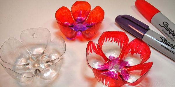 Você também pode pintar a sua flor feita de garrafa pet com canetas permanentes coloridas, se você gosta e praticidade.