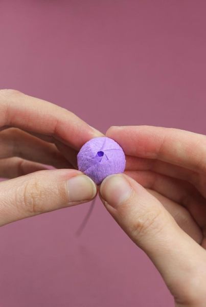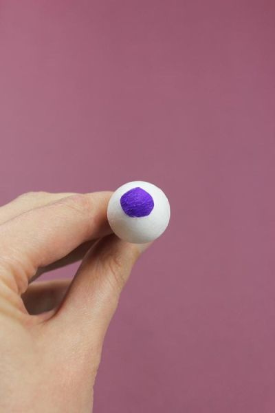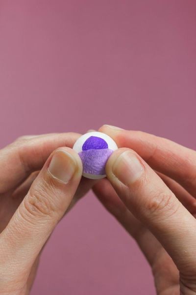 Em seguida, cole um círculo de papel crepom no meio da bolinha de isopor, na parte de cima.