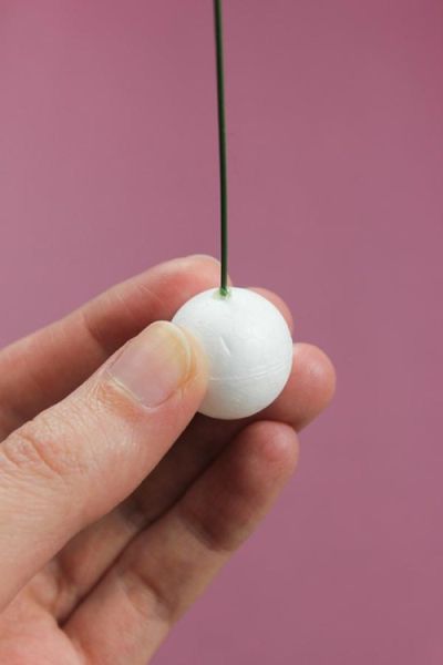 Agora, fure a bolinha de isopor com um pedaço de arame floral que será o caule de sua flor ao final. Depois retire o arame, aplique cola quente e cole o arame floral em sua bolinha de isopor.