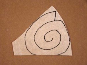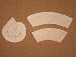 Em seguida, em cada uma das três partes, recorte um caracol, mas não risque o filtro, faça o caracol somente cortando com a tesoura; o caracol não precisa ficar perfeitamente redondo. Esta tira tem tamanho aproximado de 1,5 cm a 2 cm de largura.