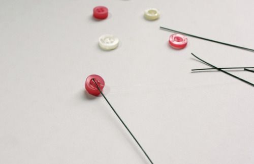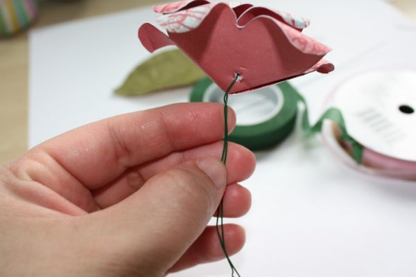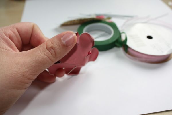 Logo após, passe um pedaço de arame floral pelo furo na base da rosa.