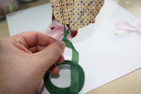 Agora, junte as folhas no caule da sua flor e passe a fita floral.