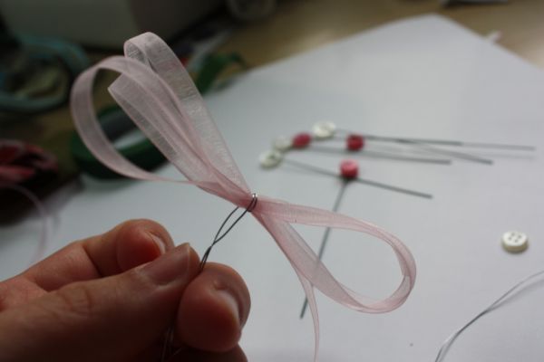 Em seguida, para finalizar a sua peça, junte os arames com botões e o arame com o laço e passe mais fita floral, para ficar firme. E está pronto!