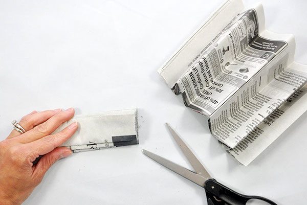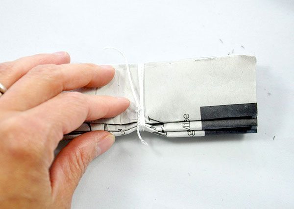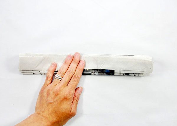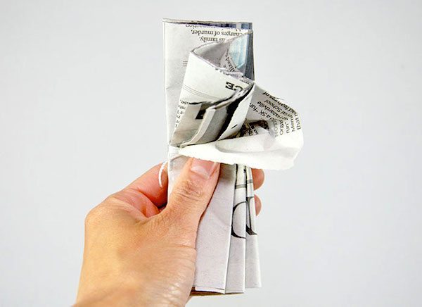 Em seguida, posicione várias folhas de jornal juntas, umas sobre as outras. E comece a dobrar as folhas de jornal de forma “sanfonada”, com a espessura das dobras de acordo com a sua preferência. Lembrando que quanto mais folhas de jornal você posicionar juntas, mais “cheia” e “fofa” ficará a sua flor.