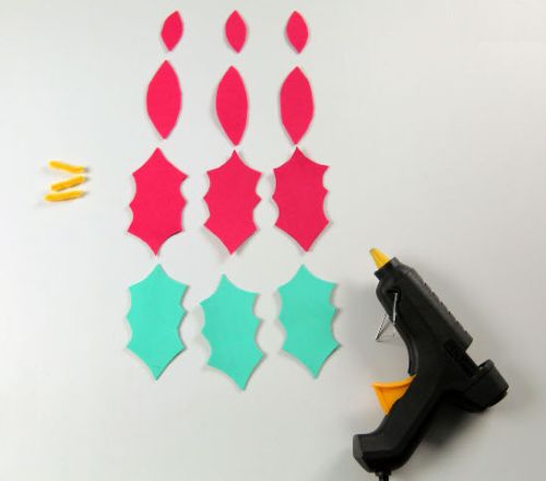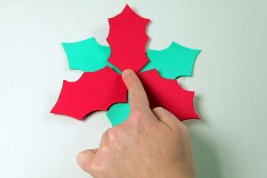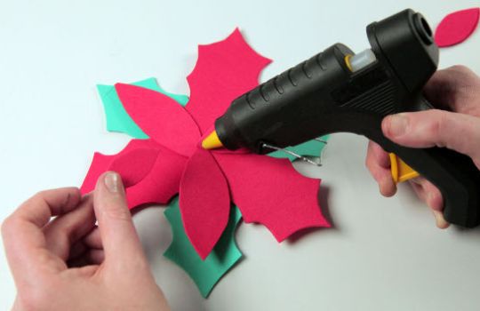 Em seguida, una as pontas das 3 folhas verdes da flor natalina e cole-as com o auxílio da cola quente.