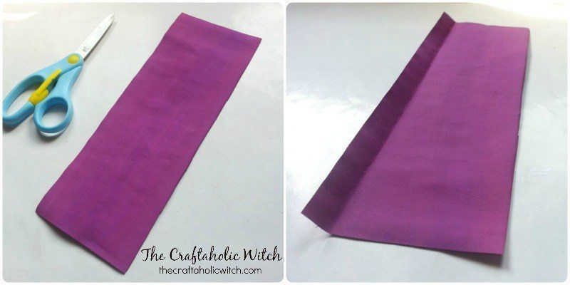 Comece separando todos os materiais que você vai utilizar em seu artesanato. Corte uma tira larga no papel que será usado para fazer a flor. Dobre uma parte, pelo sentido do comprimento da tira de papel.