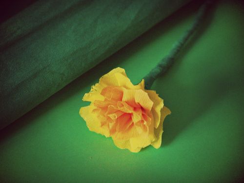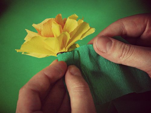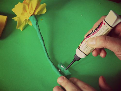 Agora, enrole a tira de papel crepom verde ao redor da base de sua flor, escondendo muito bem o arame.