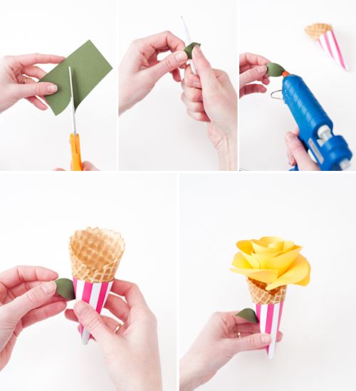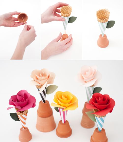 Créditos:http://ohhappyday.com/2012/03/diy-paper-flower-cone-bouquets/.