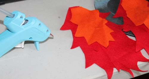 Enquanto as garrafas estão secando você deve fazer o “fogo” do foguete. Para isso você deve recortar as pontas do papel crepom ou TNT de forma triangular e imitando fogo de verdade. E faça camadas com este “fogo”, com o vermelho por baixo e o laranja por cima e cole um sobre o outro com a cola quente.