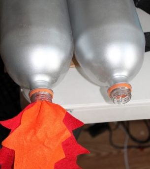 Agora basta posicionar o “fogo” dentro da boca da garrafa e colar com cola quente. E após fazer isso nas duas garrafas, cole uma garrafa na outra, posicione-as sobre o papelão, incorpore o cinto ou as faixas de tecido e está pronto seu foguete!