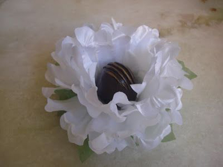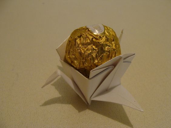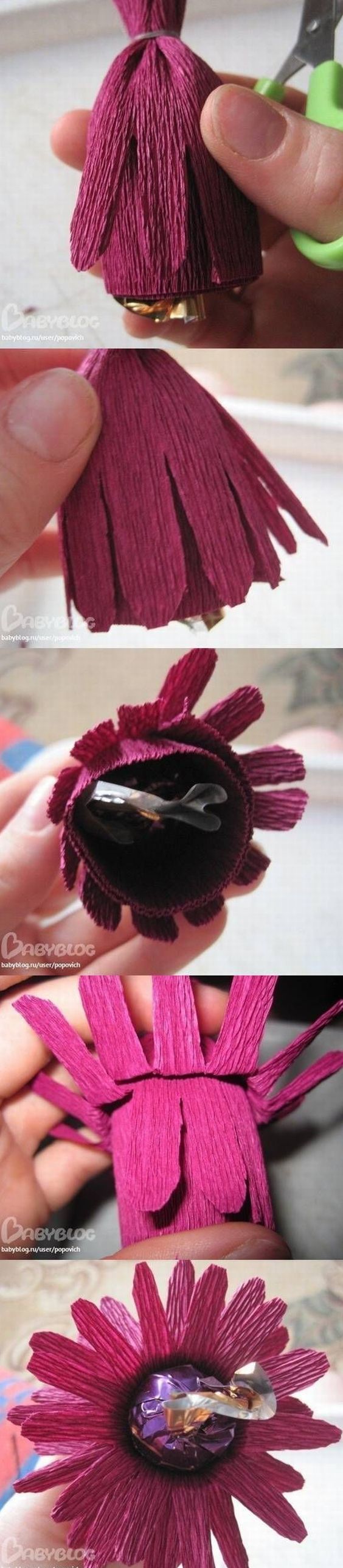 Corte uma tira de papel crepom com largura que seja maior que o tamanho do bombom escolhido. Prenda a parte de baixo da tira de papel crepom enrolada, com o auxílio de um pedaço de arame fino maleável ou de um pedaço de linha fina. Coloque o bombom dentro do rolo, no meio, e corte as camadas externas em formato de pétalas. Vá “abrindo” camadas de papel e cortando pétalas. Na camada de papel perto do bombom, se você desejar, cole-a ao redor do bombom, com o auxílio de um pedaço de fita adesiva dupla face.