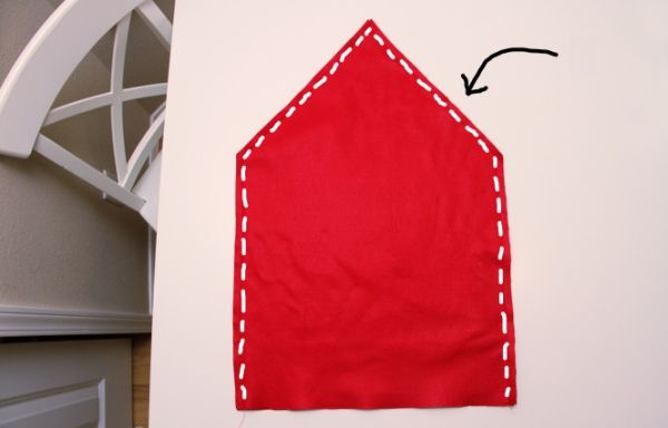 Em seguida, transfira estas medidas para o tecido vermelho, mas com uma ponta em forma de lança em um dos lados. Corte duas partes para cada cadeira e lembre-se de deixar uma margem para a costura.