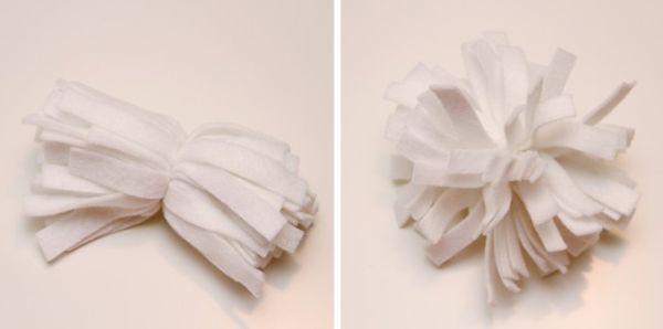 Agora, corte muitas tirinhas no feltro branco e amarre no meio delas, com um pedaço de linha. Depois arrume as tirinhas formando um pompom.