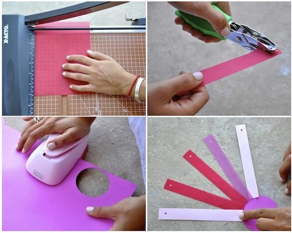 Comece separando todos os materiais que você vai utilizar em seu trabalho. Depois corte várias tirinhas nos papeis escolhidos. Fure uma das pontas das tiras cortadas, com o auxílio de um furador ou da ponta de uma tesoura, caso você não possua um furador de papel. Corte também um círculo de papel, com o auxílio de um objeto circular ou de um compasso, para servir de molde para este círculo. E comece a posicionar as tiras de papel ao redor do círculo, porém sem colar as tiras, e lembrando-se de deixar as pontas com os furos para fora.
