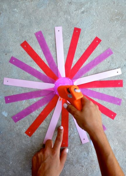Em seguida, assim que você tiver posicionado o número de tiras de papel suficiente para revestir toda a borda do círculo de papel, aplique cola quente. E deixe a cola secar muito bem antes de manusear novamente a sua peça e continuar com a confecção de seu artesanato.