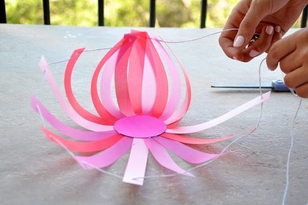 Logo após, assim que a cola estiver totalmente seca, corte um pedaço da linha de sua preferência e, com a cor também de sua preferência, e passe este pedaço de linha pelos furos das suas tiras.