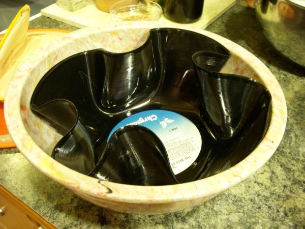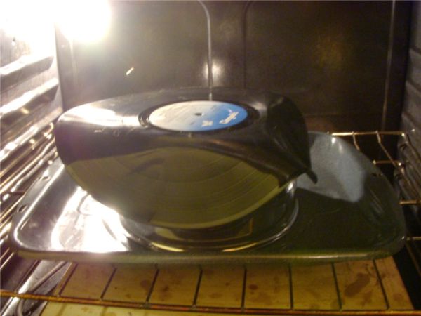 Posicione o recipiente que possa ir ao forno debruçado dentro da assadeira. Leve ao forno até o disco de vinil começar a amolecer. O tempo vai depender da potência do seu forno. Fique de olho para que não ocorram acidentes.