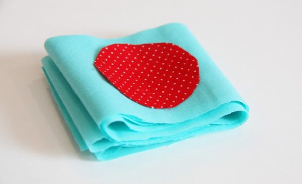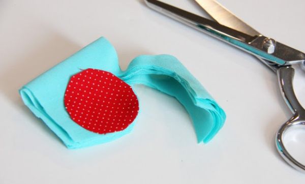 Comece cortando várias tiras do tecido escolhido e cortando também um círculo em outro tecido escolhido (ou no mesmo tecido, pois este será apenas um molde). Depois dobre as tiras como se fosse uma sanfona e por cima posicione o círculo.