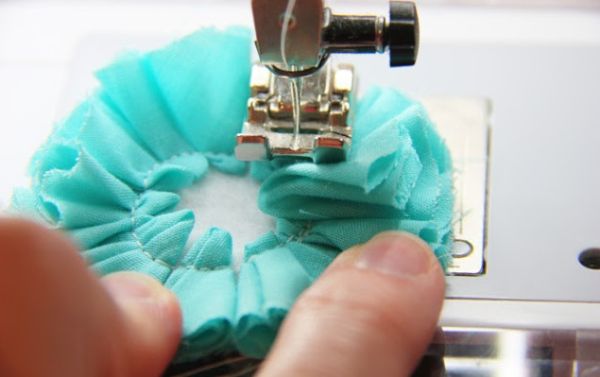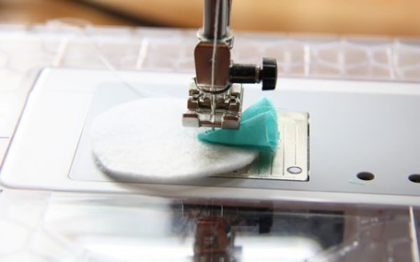 Em seguida, leve este círculo dobrado para a máquina de costura e costure em uma parte do círculo de manta acrílica, prendendo-o.