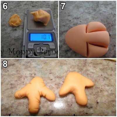 Com a ajuda da massa de biscuit cor de laranja faça os pés da galinha conforme a imagem, sempre utilizando a esteca para fazer as marcações necessárias. Em seguida faça os demais detalhes para ficar como na primeira imagem que postamo. Essa sugestão foi retirada do portal www.maosquecriam.net.br.