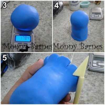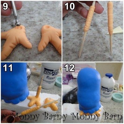 Em seguida cubra o corpo da galinha com a massa de biscuit na cor azul e com a ajuda da esteca faça marcações como nas imagens.