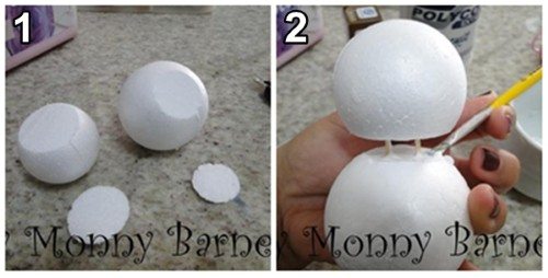 Comece montando o corpo da galinha, para isso você irá precisar de bolinhas de isopor, cortadas com um estilete e preso entre si por palitos de dentes, conforme mostra a imagem.